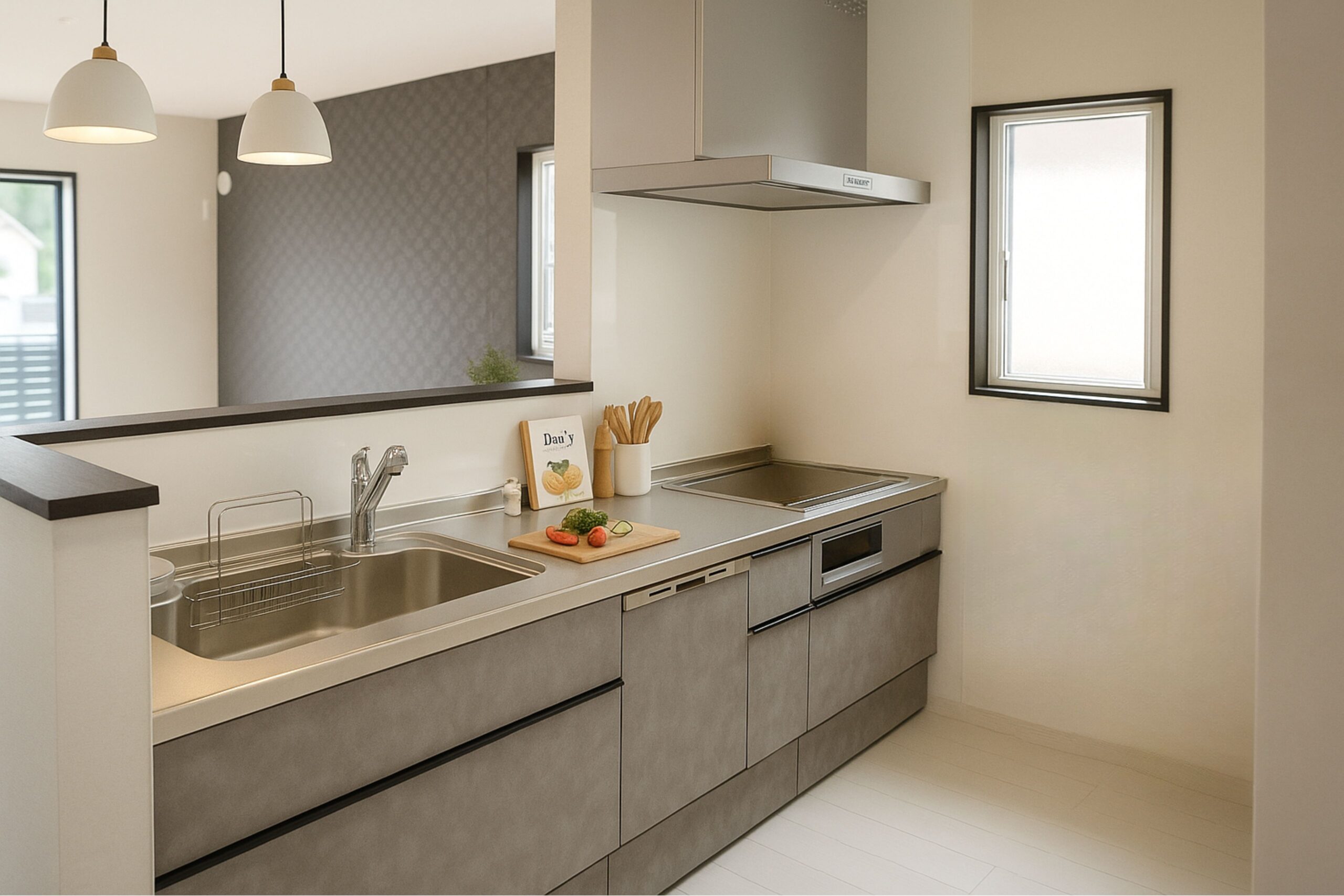 やさしく差し込む窓辺の自然光を、カウンターとグレーの面材が柔らかく反射し、清潔感あふれるワークスペースを演出。腰壁越しにリビングダイニングを見渡せるレイアウトは、調理中でも家族とのコミュニケーションを妨げません。