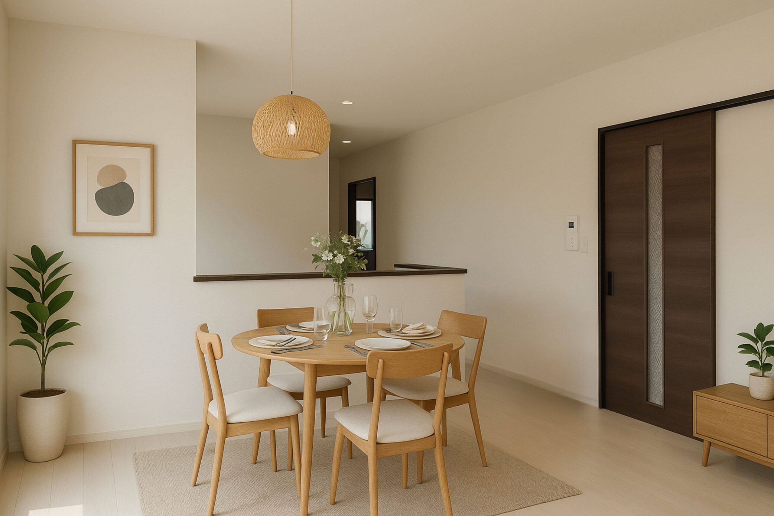 やわらかな自然光が白い床に反射して、空間全体を明るく包み込むリビングダイニング。壁や天井は落ち着いたベージュトーンで統一され、角を落とした開口部や低めの腰壁が視線をゆるやかに誘導しながら奥行きを生み出しています。