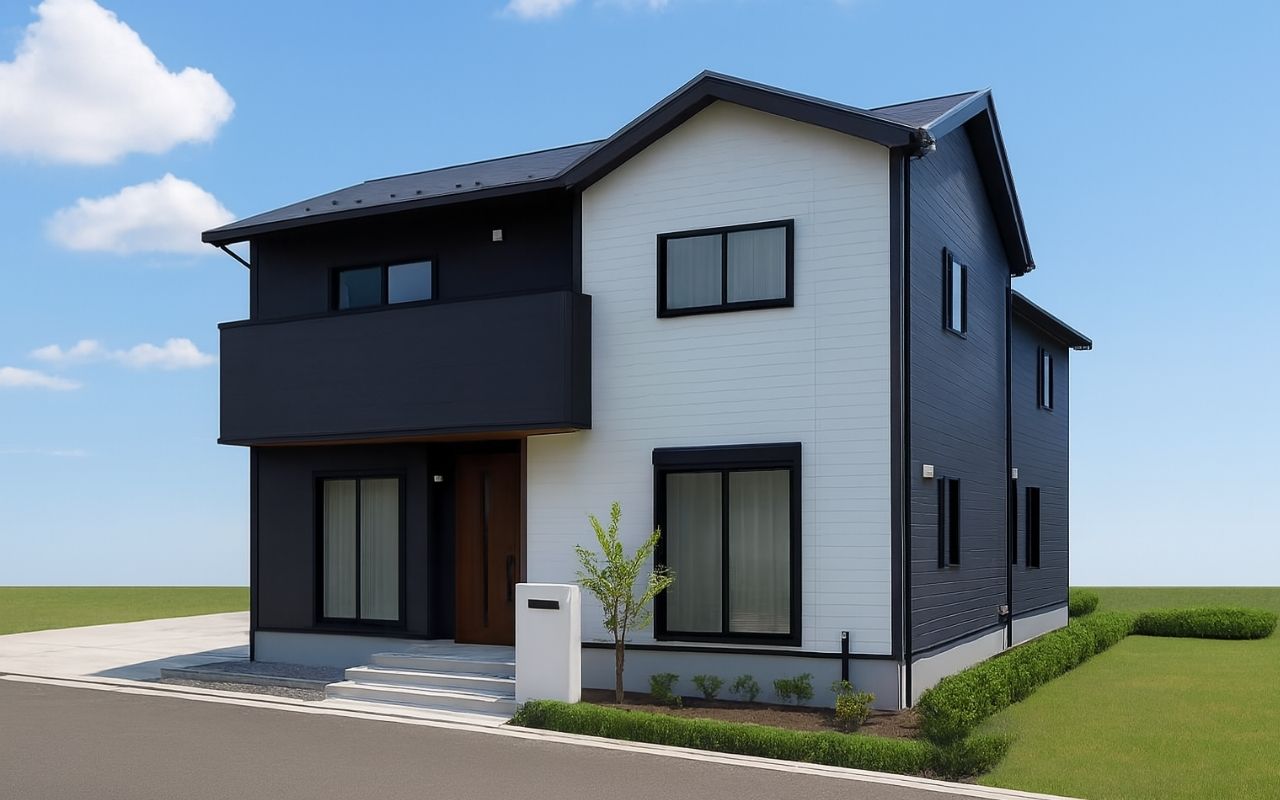 黒と白の外壁が美しく調和した、直線的でスマートなデザインの2階建て住宅。 大きな窓やバルコニーが印象的で、光と風を取り込む設計になっています。 玄関まわりは奥行きのある構造で、プライバシーと開放感を両立。 街並みに馴染みながらも、ひときわ目を引く存在感のある外観です。
