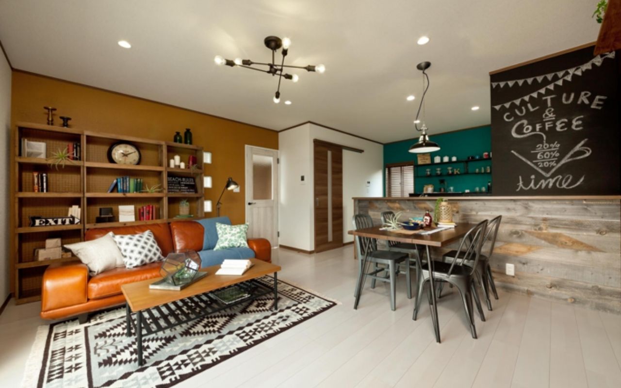 開放的な間取りに、アクセントカラーの壁面が映えるリビング空間。 天井高や照明の配置により、広がりと落ち着きのバランスが取れています。 床材や壁面の仕上げにこだわり、視覚的にも触感的にも心地よさを感じられる設計です。 日常のくつろぎから来客時のもてなしまで、幅広いシーンに対応する空間です。