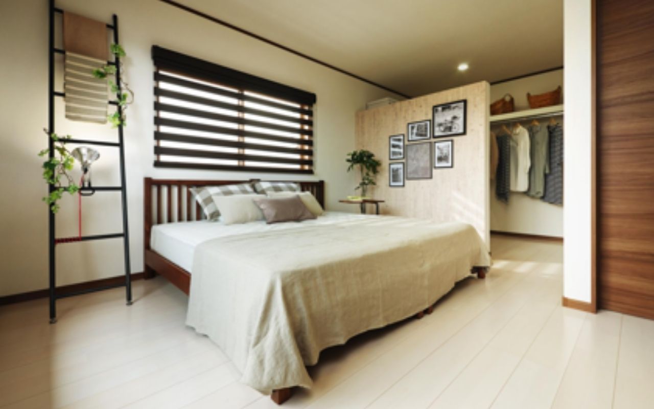 ニュートラルな色合いでまとめられた寝室は、落ち着きと清潔感に満ちた空間。 窓まわりの工夫により、光の調整とプライバシーの確保が可能です。 壁面のデザインや収納の配置にも配慮し、すっきりとした印象を保ちながら機能性も充実。 一日の終わりに心をほどく、穏やかな時間を過ごせる場所です。