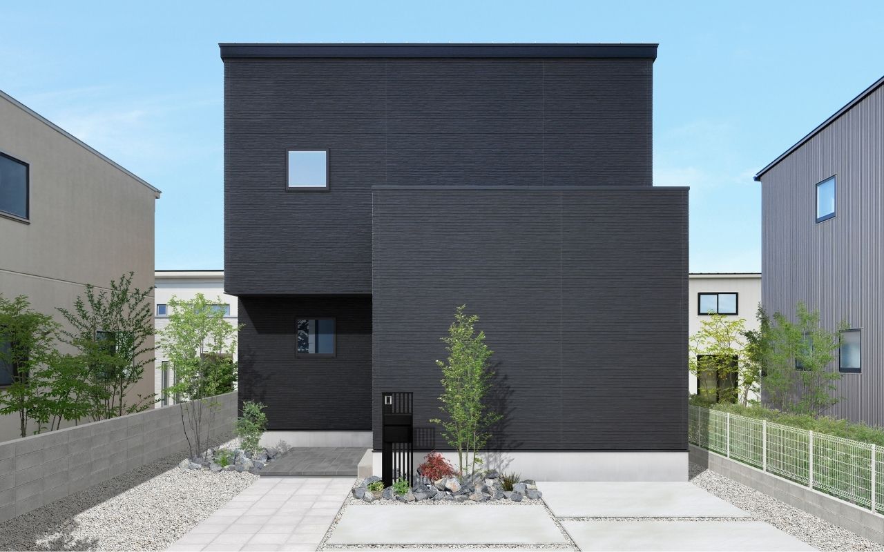 シンプルなフォルムに深みのある色合いが映える、落ち着いた佇まいの住まい。直線的なデザインが、現代的で洗練された印象を与えます。周囲の街並みに自然と馴染みながらも、しっかりと個性を感じさせる外観です。 -