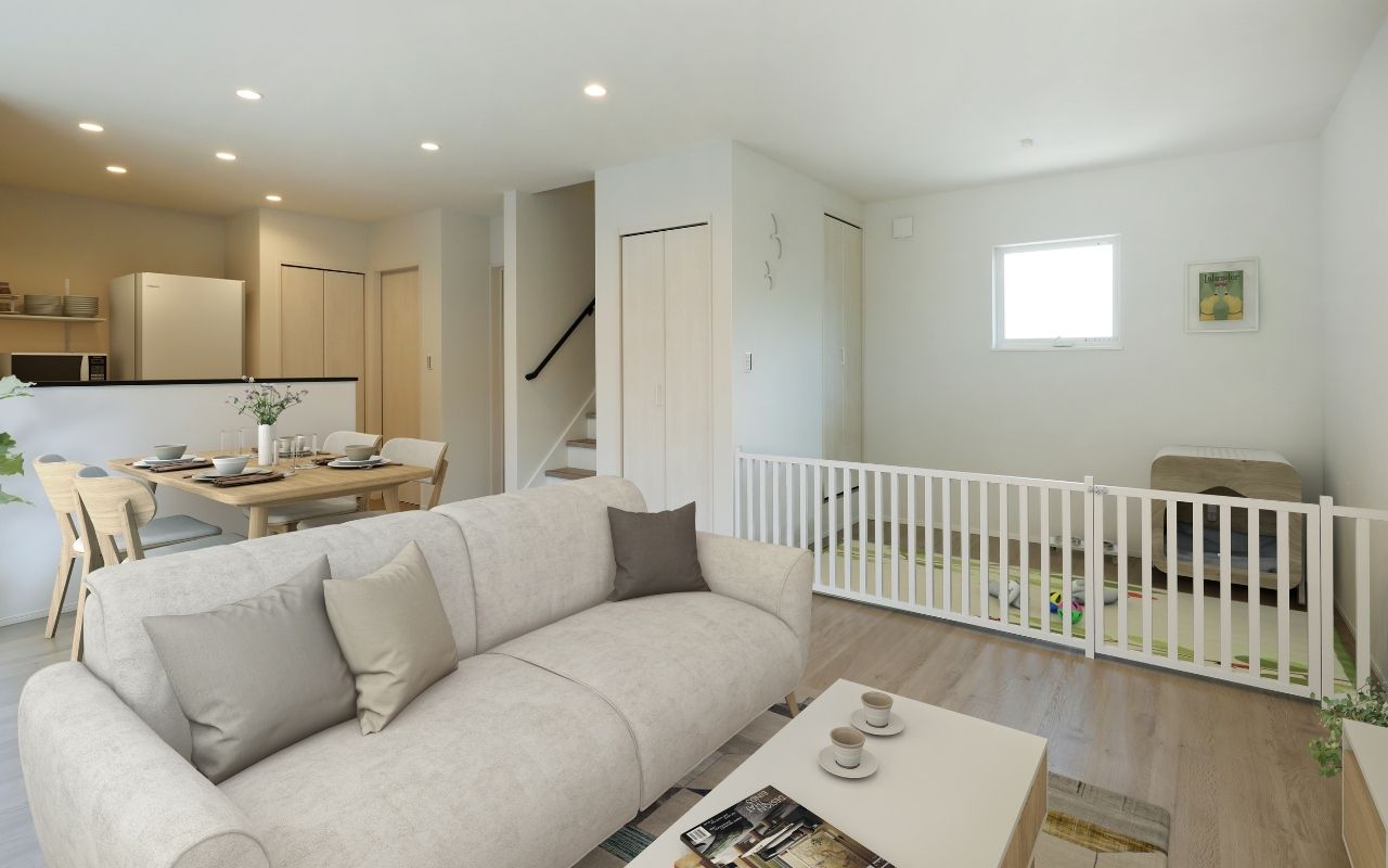 光がたっぷり差し込む、開放感のあるリビング空間。家族の動線を意識した設計で、日常の過ごしやすさを大切にしています。階段やキッチンとのつながりもスムーズで、暮らしの中心となる場所です。 -