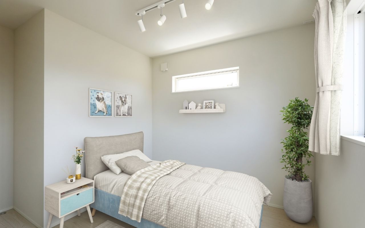 やわらかな色使いと整ったレイアウトが、心を落ち着かせる寝室。窓からの自然光が、朝の目覚めを心地よく演出します。シンプルながらも、暮らす人のリズムに寄り添う空間です。